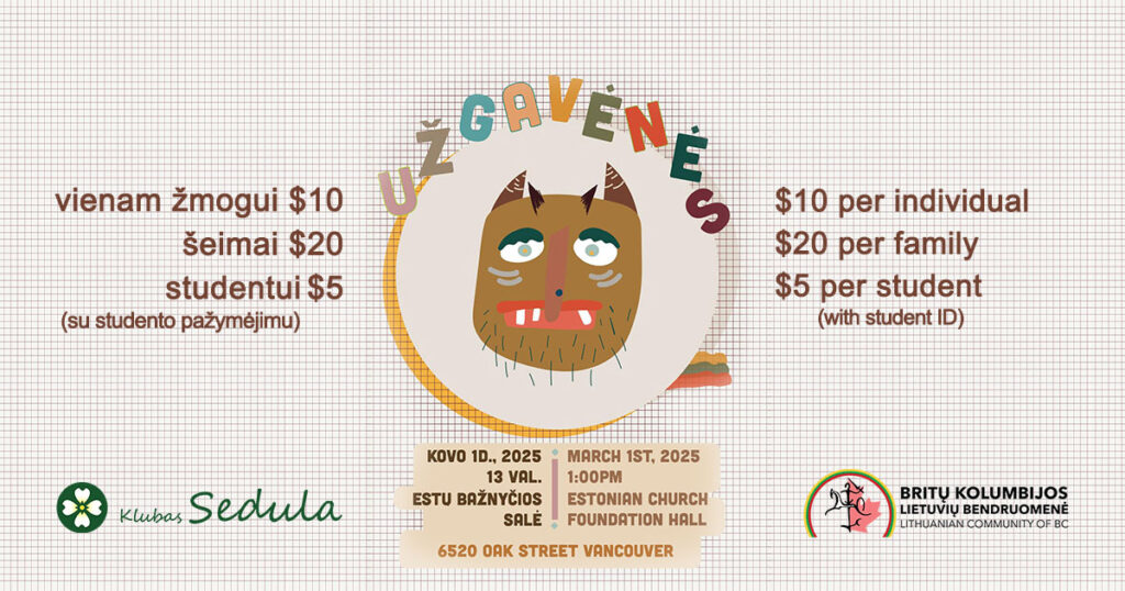 Švenčiame Užgavėnes!Britų Kolumbijos Lietuvių Bendruomenė ir Klubas „Sedula“ kviečia visus susirinkti švęsti Užgavėnes – kugelis, blynai, blyneliai, Kaziuko mugė (vaikai-pardavėjai), tradiciniai šokiai ir žaidimai, kaukių gamyba; smarkiai trypsime ir žiemą varysime! Lašininio ir Kanapinio kova!Kur: Estų bažnyčios salė, 6520 Oak Street, Vancouver. Kada: Kovo 1d. 13:00. Vaišės: kava, arbata, blynai ir kugelis.Šventės programa: 13:00 -14:00. Kaziuko Mugė (tik grynais); kaukių dirbtuvės. 13:00 -15:00. Valgome daug. Varome žiemą. 15:30. Atsisveikiname su žiema.  Bendruomenės choras “Balsai” pasirodymas.  Kviečiame visus pasipuošti Užgavėnėms.**Įėjimo siūloma